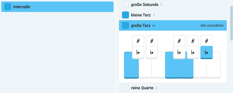 reine Prime, kleine Sekunde, große Sekunde, kleine Terz, große Terz, reine Quarte, übermäßige Quarte, verminderte Quinte, reine Quinte, kleine Sexte, große Sexte, kleine Septime, große Septime, reine Oktave, übermäßige Oktave, große None, kleine Dezime, große Dezime, reine Undezime, übermäßige Undezime, reine Duodezime